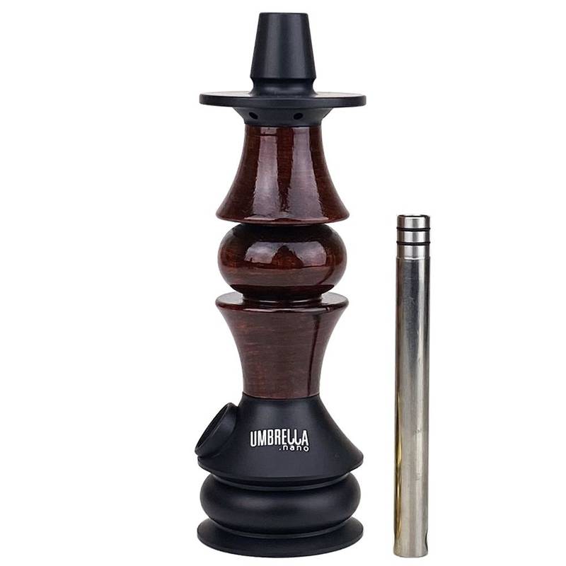 Stem da marca Marajah Hookah modelo Umbrella, corpo em madeira nobre, ponteira e coração em alumínio anodizado. Esse produto requer muito cuidado na hora da limpeza para preservar a beleza e qualidade que somente os produtos Marajah Hookah pode oferecer. Sem roscas, facilitando a limpeza da peça, sem riscos de travamento. A down-stem possui difusor embutido. Seu material é atóxico, ou seja, não faz mal a saúde.